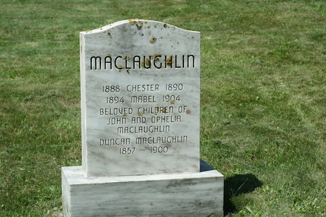 This stone was erected in the late 1980s by Nelson MacLaughlin, then MLA in the Province of Alberta, son of John and Ophelia MacLaughlin. Ophelia was sister of Charles D. MacLean. His sister was Helen (MacLaughlin) Black who also lived in Western Canada.