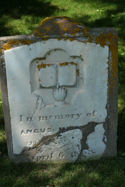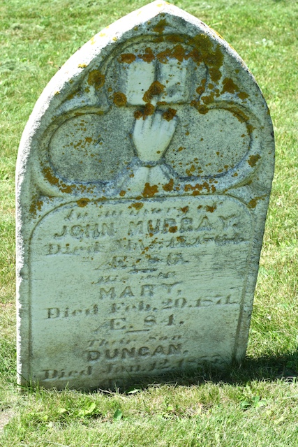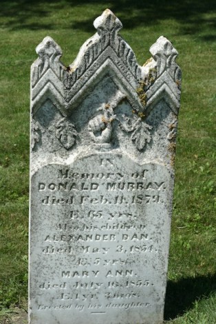 In memory of Angus Murray, born in 1808 and died April 6, 1858 at 49 by drowning after his horse went through the ice.