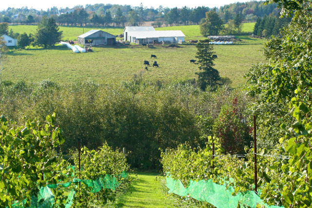 Looking down the rows of grapes and across to MacQuarrie’s farm