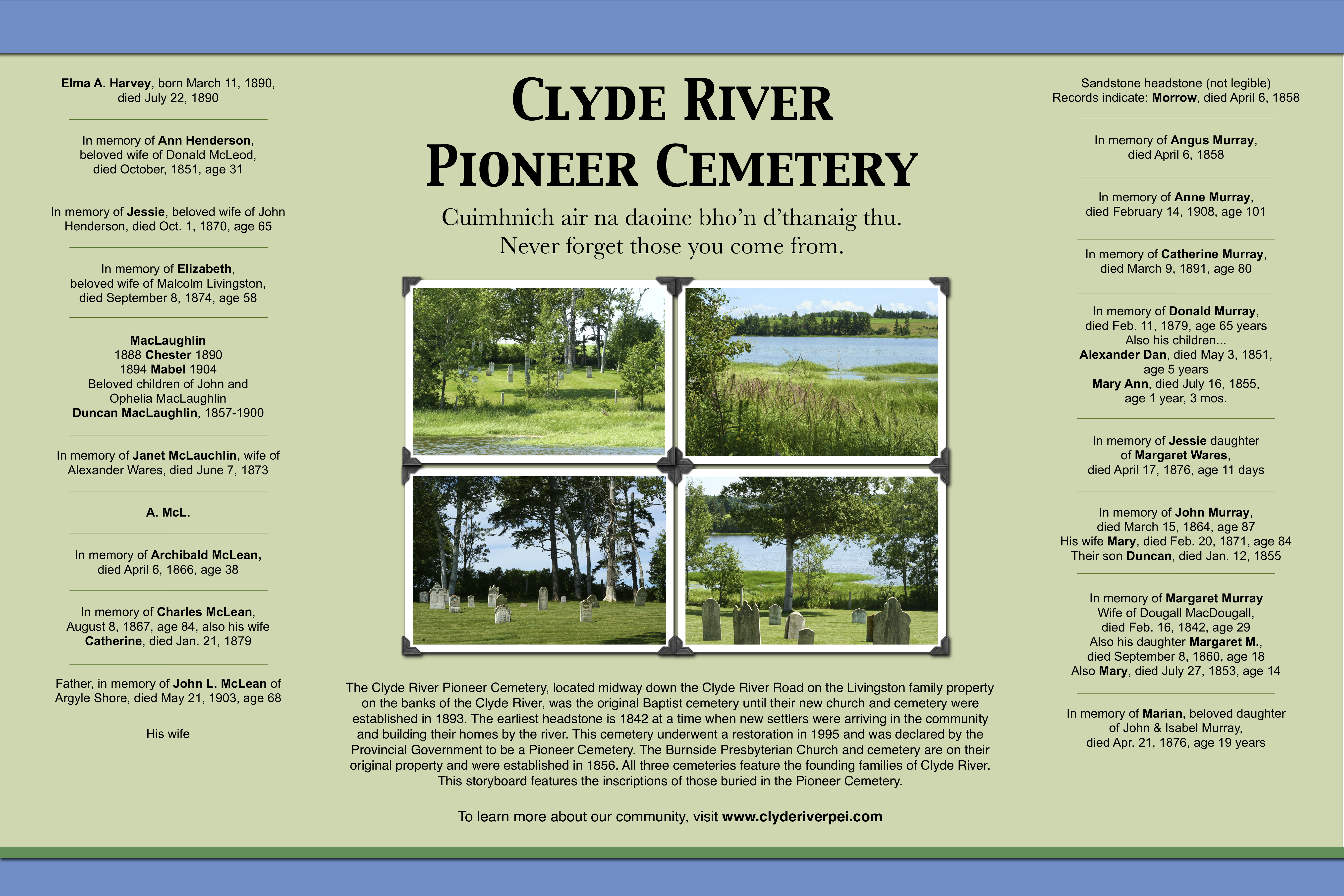 The Pioneer Cemetery was the original Baptist cemetery in the community until the current site was established beside the Clyde River Baptist Church. Just across the road is Burnside Presbyterian Church and cemetery, so for genealogical researchers, it will be convenient to have access to all the information within close proximity.