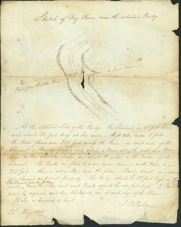 At the intended site of the bridge the channel is 65 feet broad and about 2 1/2 feet deep at low water. High tides raise 9 feet. The water flows over 325 feet across the river, on each side at the channel is marshy ground into which a man’s strength will, at a blow, drive an oar about six inches and about 12 inches in the bottom of the channel. The banks are flat, but are near covered with water beyond 325 feet. There is not a stone near the place. Timber small, very scarce, and claimed as private property. The bridge should be 15 feet high in the centre of the channel, from the bottom, and the pier next each bank should be six feet high. 9 piers would be required, and two abutments, one at each edge of the channel. No ice, or current, to hurt.