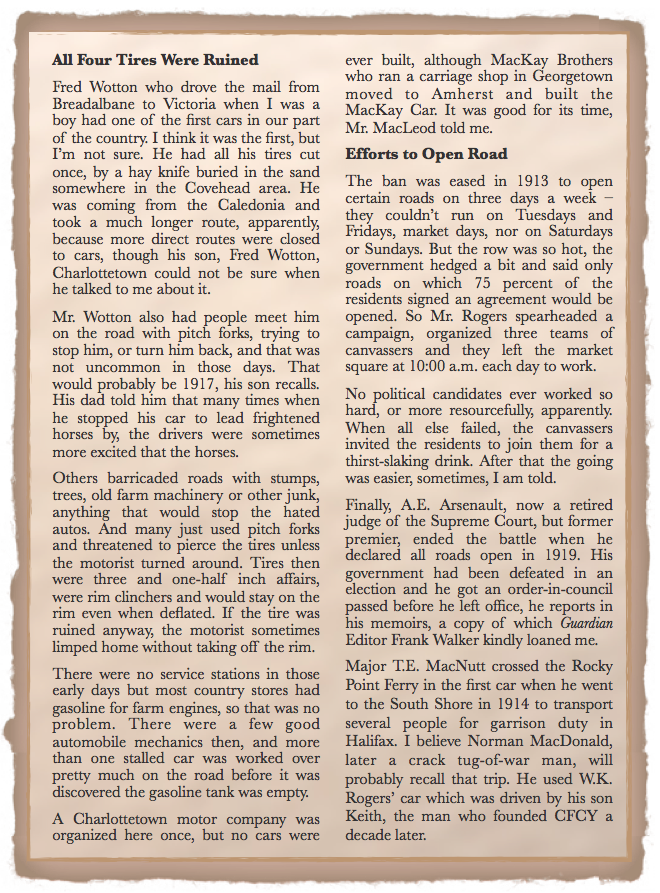 “In 1916, W.K. Rogers of Charlottetown offered his car to a young officer to visit his family in Tignish before going overseas. It was the first car to be driven from Charlottetown to Tignish. Rogers was fined several times, but he never paid them.” from The Guardian