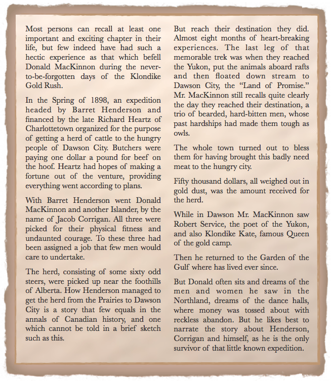 Frank Gillespie’s story of adventure during the Klondike Gold Rush has me temporarily hooked on adventure stories from those days. I found a news clipping in My Mother’s Scrapbook about another Island chap, Donald MacKinnon written by Frank MacArthur in The Guardian, 1943.