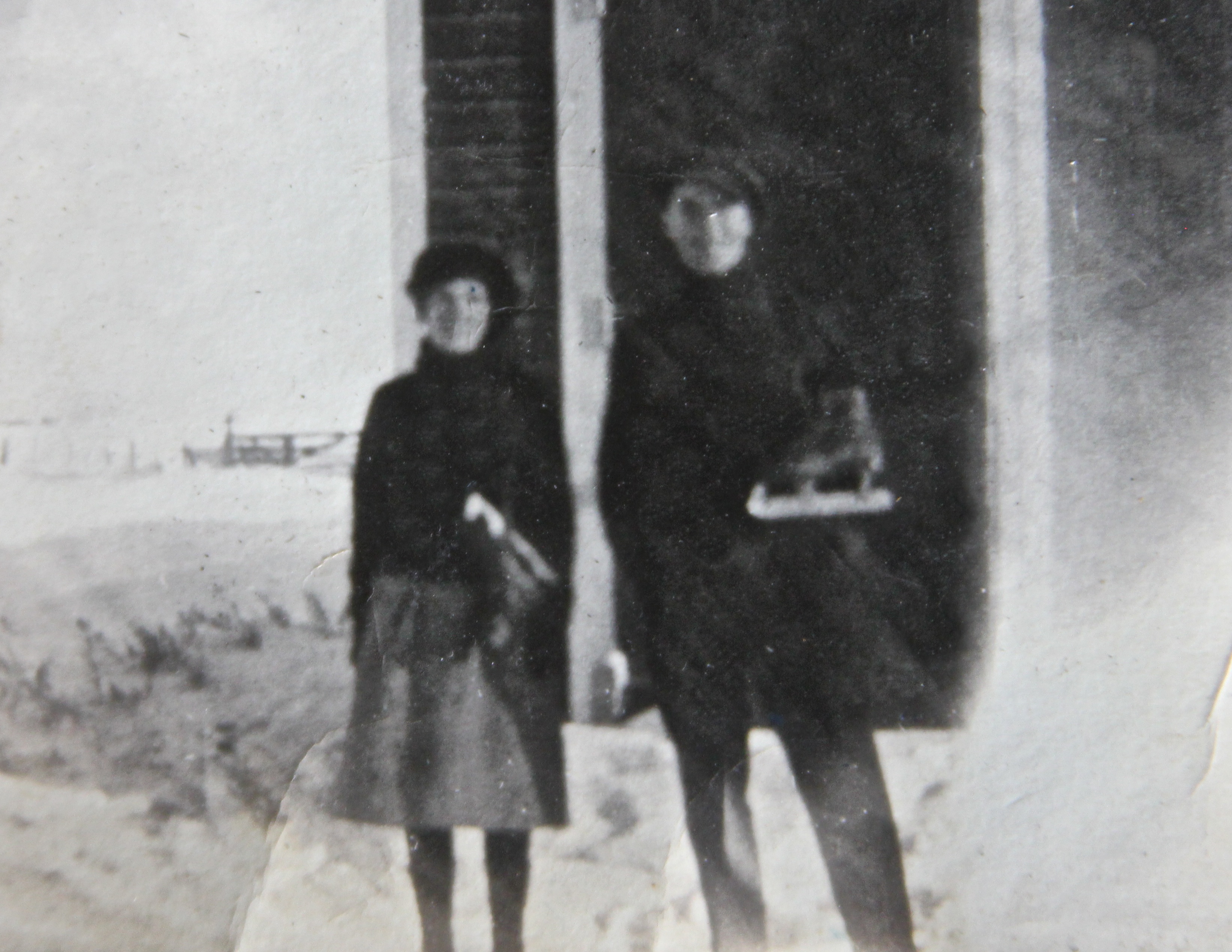 The girls wore suits and skates that they had ordered from Eaton’s catalogue. Their tube skates were black leather. Skating suits, which were a jacket and pants, were made out of blanket cloth, navy trimmed with red or brown trimmed with beige. She said they were very warm.