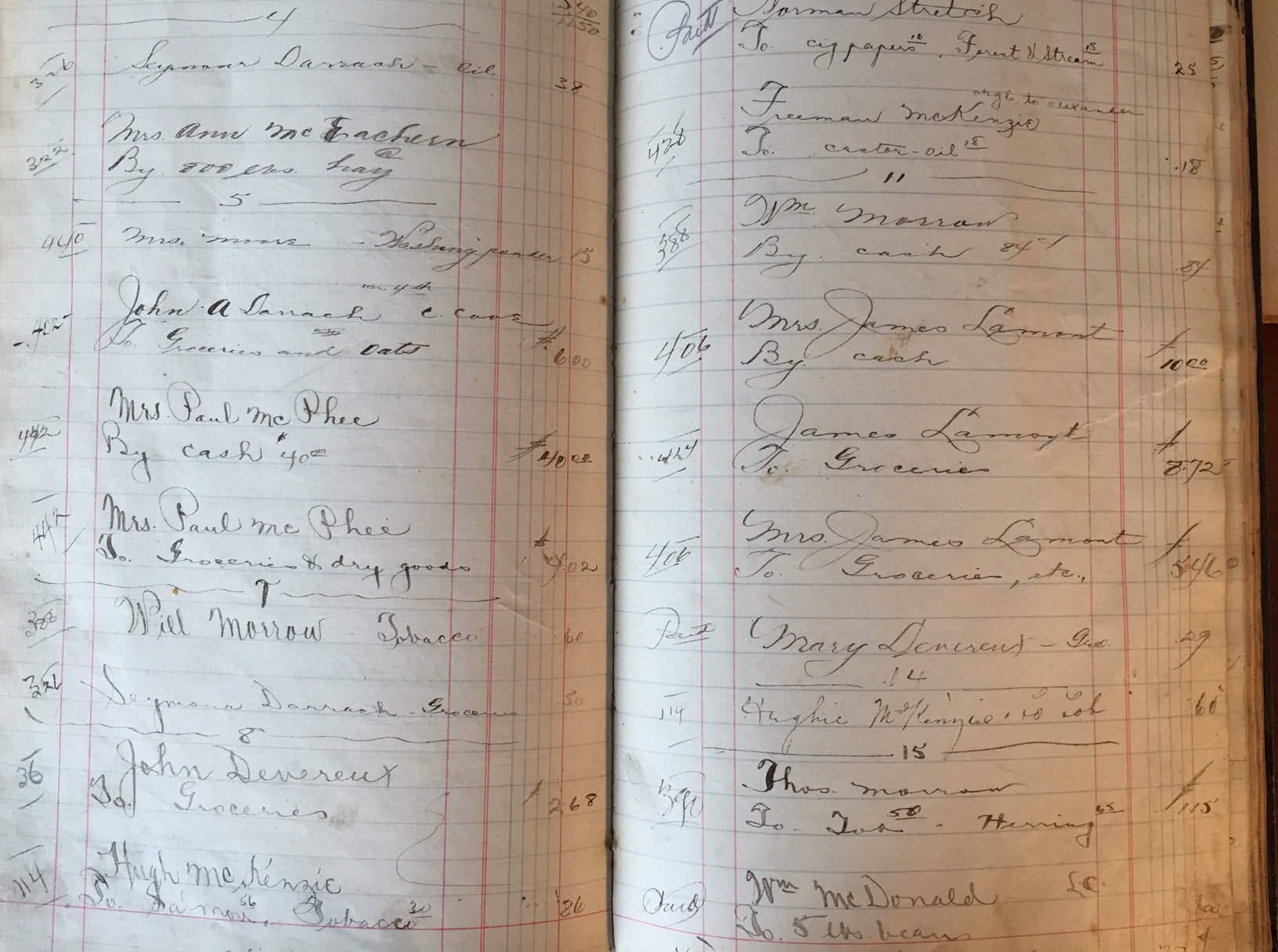 Here are some items that were purchased and recorded in the books: Paris Green, tobacco, canned salmon, eggs, sugar, candy, cider, umbrella, work shoes, flour, blankets, caster oil, butter, pins, fish, men’s boots, khaki pants, soap, cigarettes, gum, cream of wheat, salty cakes, teapot, hen feed, ribbon, cigars, oil cake, stockings, oatmeal, bale twine…and these are only a few of the many items offered. In a follow-up article, I made a list of items from one of the two record books from July 1919 to April 1922 and there were almost 300 unique items mentioned and oftentimes purchases are just referred to groceries, dry goods or goods, so Berrigan’s was a well-stocked store.