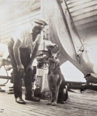Peetsa was the mascot of the freighter “Hermonthis” out of Hamburg, which with three other ships of her type were lying in the harbour of Callao, seaport of Lima, Peru. A Canadian ship had a veritable “field day” when the enemy ships tried to escape the harbour, and after much excitement, a lifeboat filled with prisoners gave over its crew. Peetsa, a scared little puppy was the last aboard and, at the risk of his life, Able Seaman Ed Suffern managed to get him on board via a garbage pail.