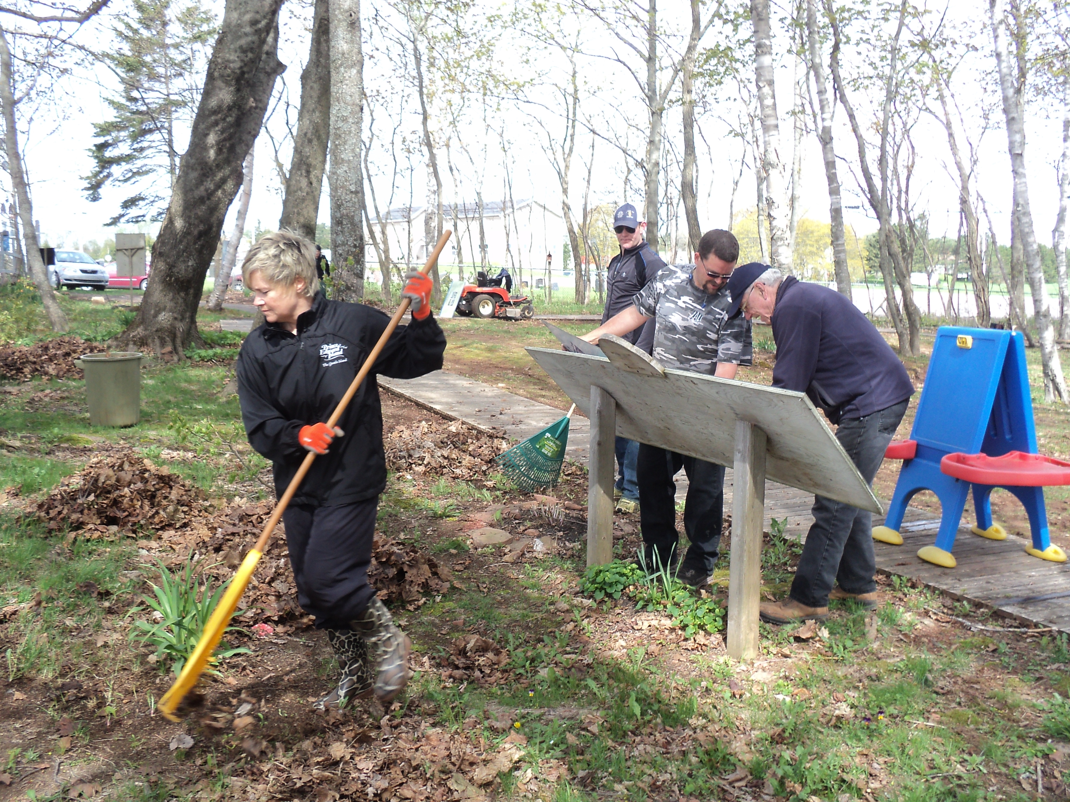 Previous Image Next Image DSC02006 Kevin and Vans put up the Story Boards while Hon Valerie Doherty and Chris MacEwen rake leaves