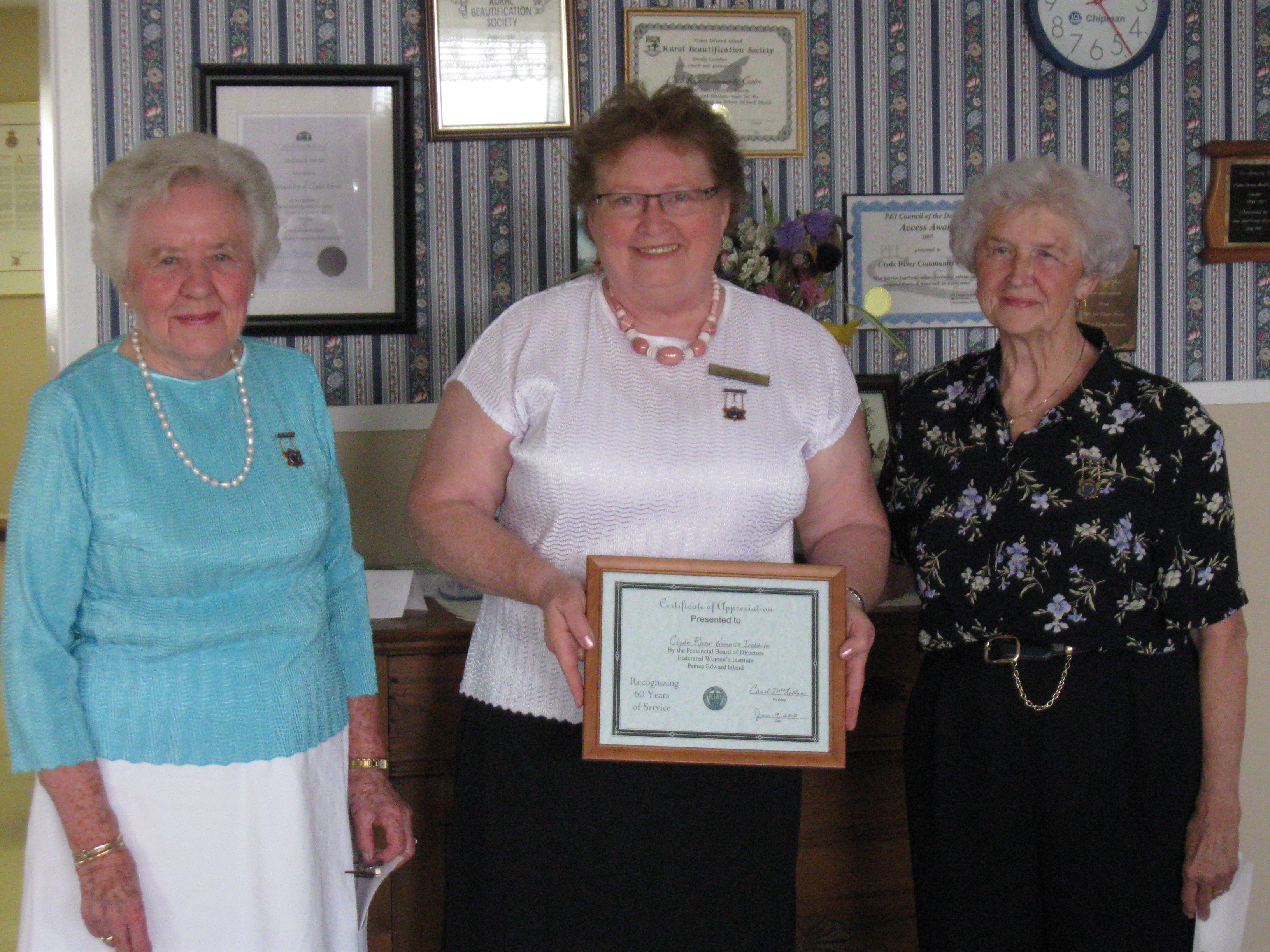 Previous Image Next Image PEIWI President Carol MacLellan presents a certificate to Helen MacPhail and Betty Watts