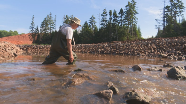 Daryl Guignion walks a newly reconstructed stretch of the Clyde River where a bridge will soon be built for the Cornwall bypass. (Brian Higgins/CBC)